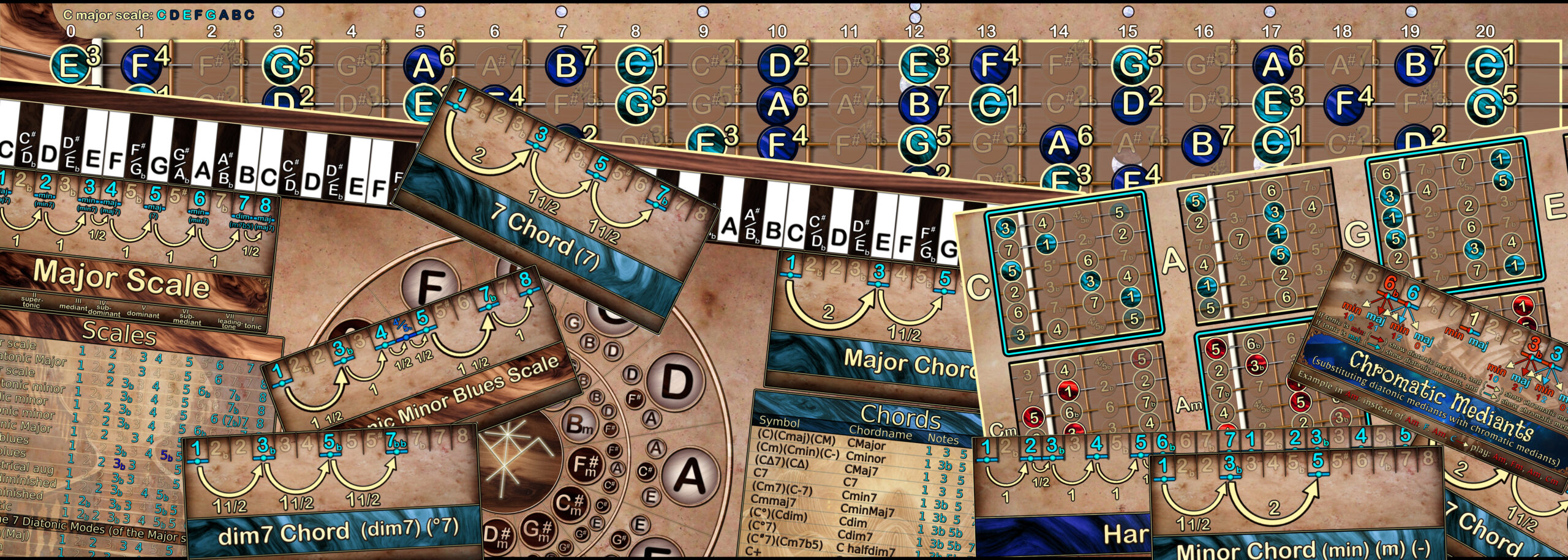 ● Een uitgebreide set aan Toonladder- en Akkoorden kaartjes.