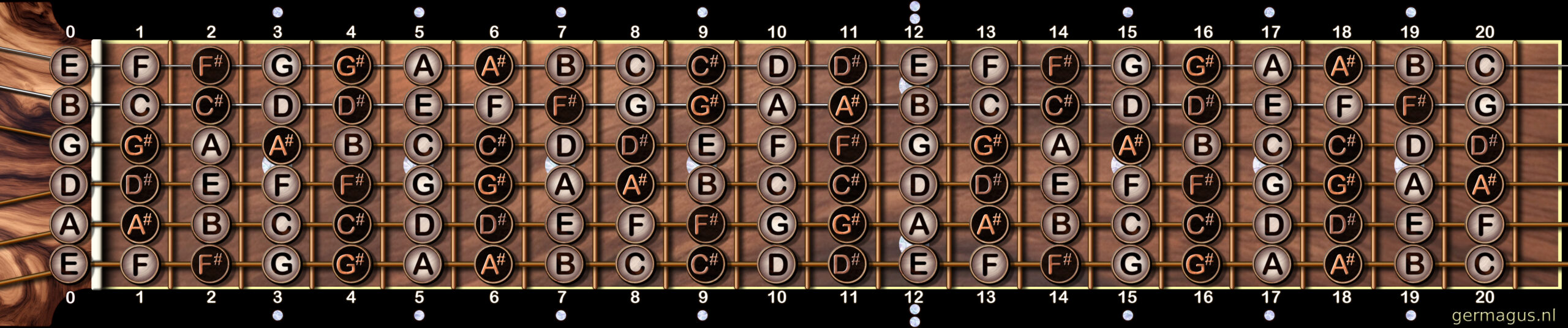 ● Een overzicht van alle noten op de gitaar.